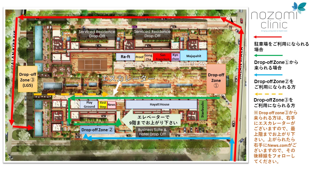 他の方法としまして、ミッドバレーからGardens Complimentaryシャトルバスに乗車し、Mont Kiara インタナショナルスクールで下車していただくと、徒歩5分ほどでご来院頂くこともできます。